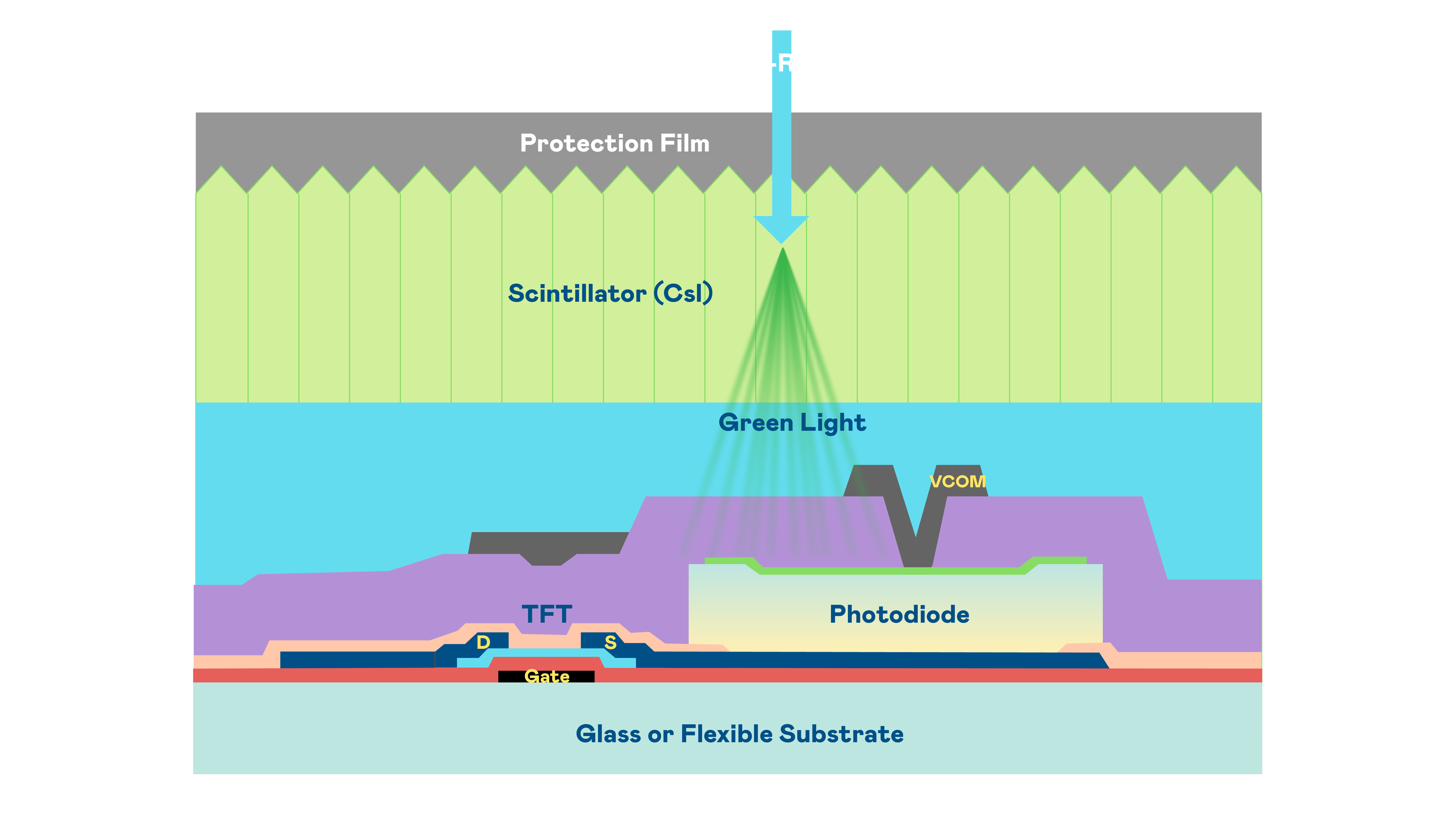 乐天使的X光影像感测阵列使用薄膜电晶体 (TFT) 作为每个像素的读取开关,搭配光电二极体(Photodiode)的光电转换元件,用以感测X光影像讯号。